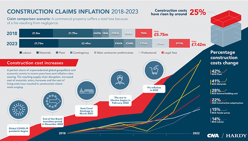 All this has led to multiple collapses among homebuilders and an inflationary spiral that has included a 14% hike in labour costs and 41% rise in material costs. The result is significant claims inflation, with a like-for-like claim costing £5.75m in 2018 compared to £7.42m in 2023, as show in the graphic below.i