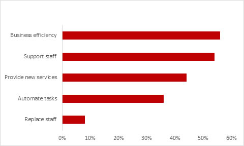 Healthcare firms’ plans to invest in new technologies were highlighted in our Risk and Confidence survey undertaken earlier in the year, which revealed that 60% of UK healthcare leaders were planning investment into technology this year. While 56% were looking to create business efficiencies, some 44% wanted new technology to provide new services and products and just over a third (36%) were keen to automate tasks. Overwhelmingly, the industry sees technology as a tool for supporting staff and partners to work more effectively – rather than replacing humans. Indeed, only 8% of the healthcare bosses we researched were looking to use technology to replace staff.