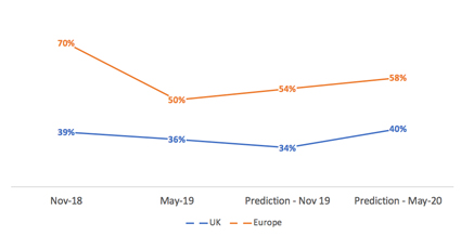 European business leader nerves were less jittery last autumn compared to their counterparts in the UK. However, despite European risk perception dropping nine percentage points since November ‘19, risk concerns are predicted to rise again by May ’20 when the impact of Brexit is likely to bite.